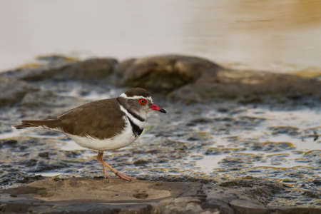 Three-banded plover (Charadrius tricollaris) closeup standing on a rock in a river in Kruger National Park, South Africa with blurred background and copy space