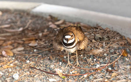 Nesting Killdeer Charadrius vociferus female wading bird guards her nest and eggs by puffing up in Sarasota, Florida.