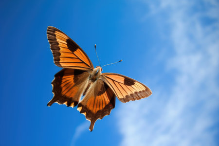butterfly, fluttering its wings in flight, against blue sky, created with generative ai