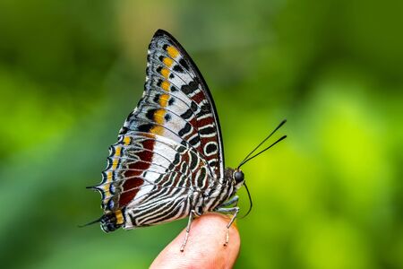Close up of Little Map (Cyrestis themire) butterfly perching on human hand, dorsal view
