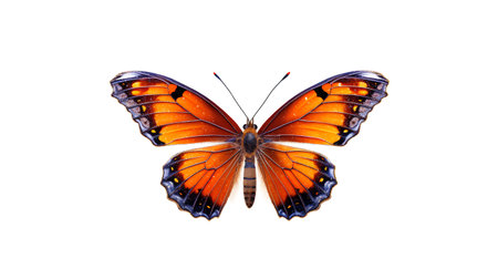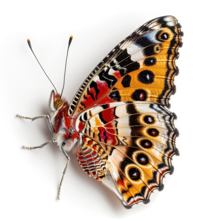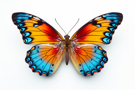 a vibrant butterfly with intricate patterns and expansive wings is captured in this meticulous and photorealistic still life photograph. the symmetrical asymmetry of the markings in red and orange adds to its visual appeal. shot on fujifilm provia, the image showcases a realist lifelike accuracy. against a white background, the layered imagery subtly conveys a touch of irony. ai generated