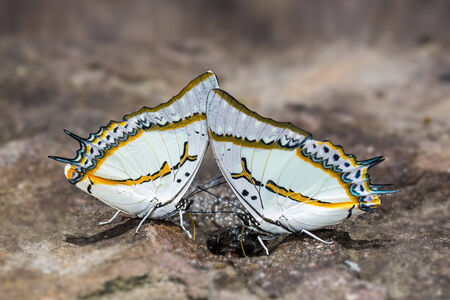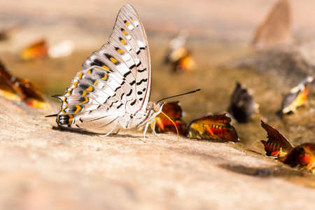 Close up of Great Nawab (Polyura eudamippus) butterflies puddling on rock in nature