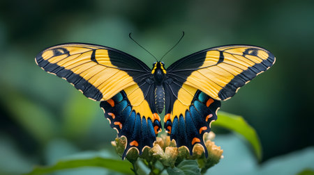 AI-generated A striking yellow and black butterfly rests on a delicate flower, its wings spread wide to reveal intricate patterns.