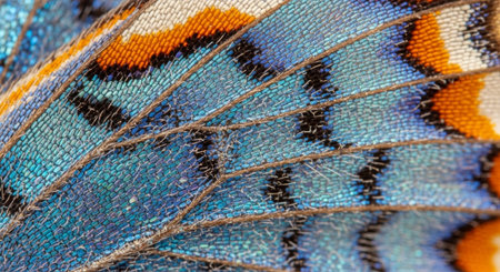 A stunning macro photograph capturing the intricate details and vibrant, iridescent colors of a butterflys wing. The shimmering scales create an abstract mosaic of blue, orange, and yellow, showcasing the delicate and complex beauty found in natures design.