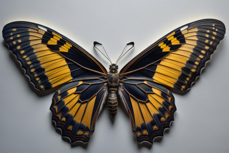 Butterfly with yellow wings and black stripes on a gray background. generative ai