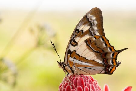 Tailed emperor, Polyura sempronius, butterfly on red torch ginger, Etlingera elatior