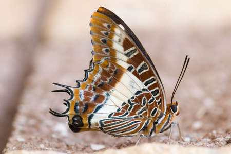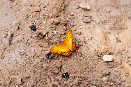 Close up of Tawny Rajah (Charaxes bernardus) butterfly puddling in nature