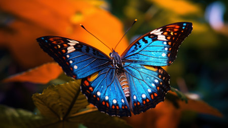 A blue butterfly sits delicately on top of a vibrant flower, showing the beauty of natures intricate details. Created with Generative AI