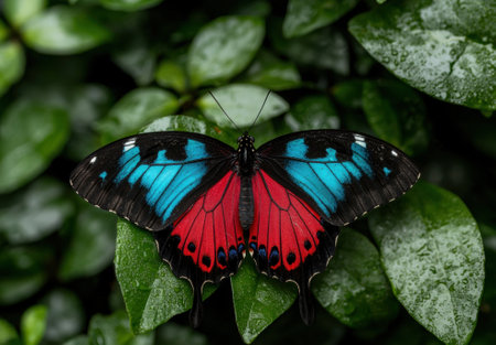 Colorful butterflies resting on green leaves