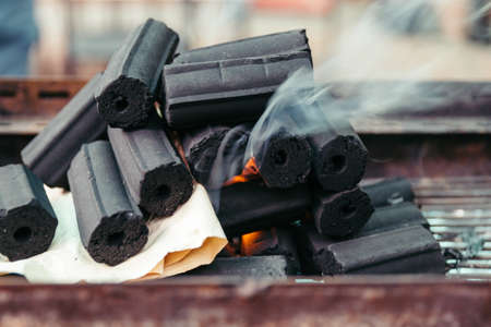 Burning charcoal cubes in the fire, close-up, background