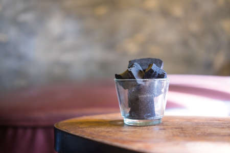 Charcoal for hookah on the old rustic wood table