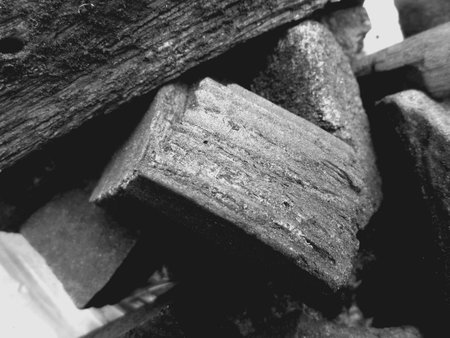 Group of charcoal black color made from real wood in studio close-up shot which use for cooking or absorb odor in room or refrigerator. And use in some cosmetic industry.