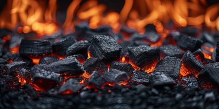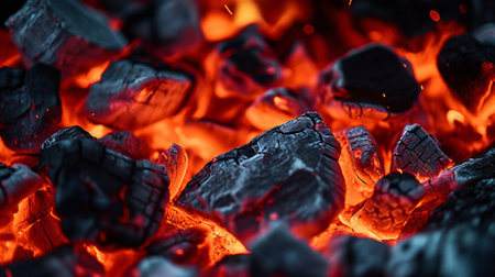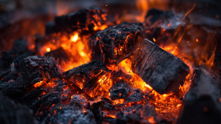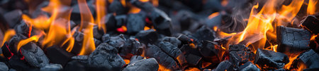 Close up of fire and embers on hot coals, ideal background for grilling or barbecue banner design