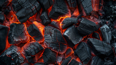 Close up view of smoldering wood embers radiating intense heat, revealing a captivating display of glowing orange cracks and intricate crevices amidst the dark, moody background