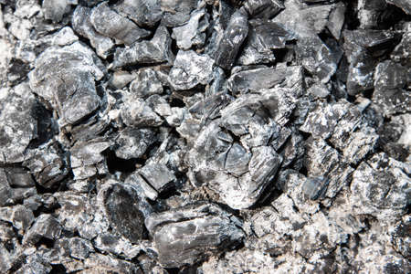 Black coal and gray cinder background of charcoal pieces cooling down. Texture of burnt wastes after recovery into energy by waste incineration