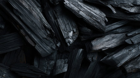 This image presents a close-up view of dark charcoal pieces, showcasing a variety of shapes and textures. The rich, black surface provides a striking and versatile background ideal for creative projects, design applications, or artistic expressions.