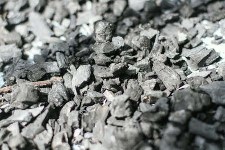 Black Charcoal on black textured floor. charcoal black carbon reesidue produced by strongly heating wood. Used for cooking or other industries. Natural wood charcoal. traditional hard wood charcoal.