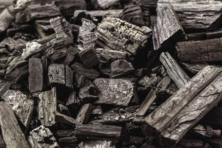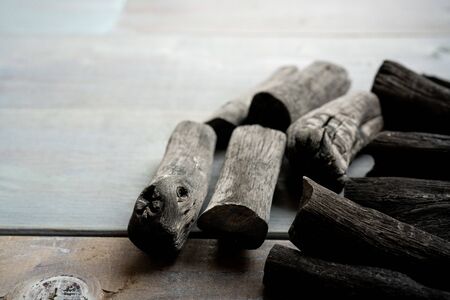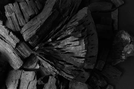 Group of charcoal black color made from real wood in studio close-up shot which use for cooking or absorb odor in room or refrigerator. And use in some cosmetic industry.
