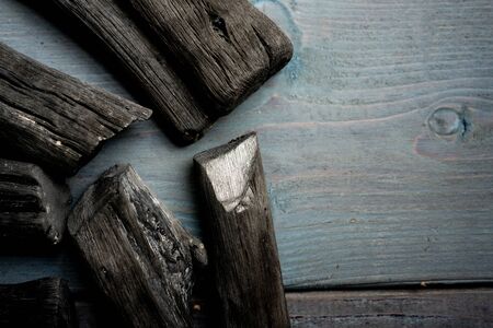 Black color wooden charcoals on dark background top view angle which made from real nature that use for cooking or heating or fire camping or absorb odor in room or refridgerator.