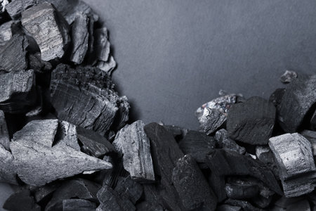 Pieces of black coals on grey background, top view. Space for text