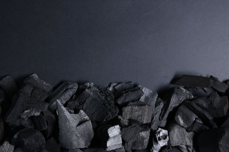 Natural hardwood charcoal on black textured background
