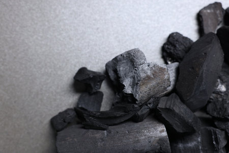 Pieces of black coals on gray table, closeup. Space for text