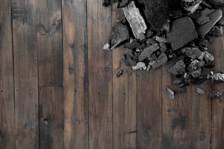 Wood charcoal. Black Charcoal on black textured floor. Used for cooking grill or other industries. Natural wood charcoal. Black carbon reesidue produced by strongly heating wood. for traditional BBQ
