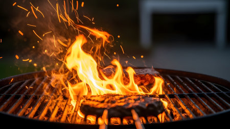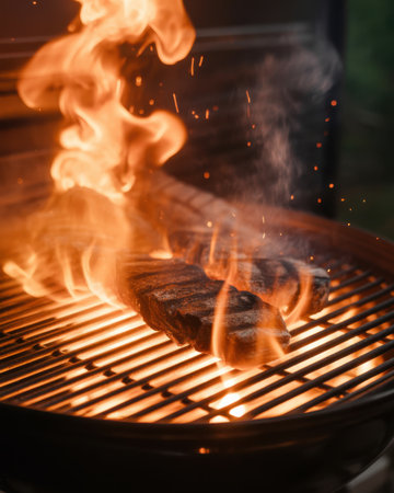 Intense Heat from a Charcoal Grill with Flames Licking the Meat for Outdoor Barbecue Cooking