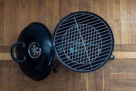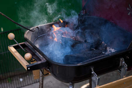 Mobile round grill with glowing charcoal, small flames and smoke, preparation for a barbecue party, copy space, selected focus, narrow depth of field
