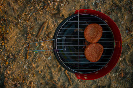 Grilling burgers on a small metal portable charcoal grill on the shores of Lac Leman in Switzerland during early winter evening with sun setting down