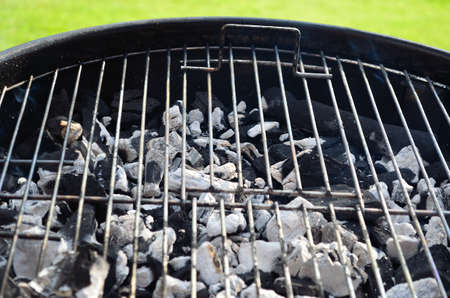 A close-up view of glowing charcoal embers and grey ash inside a barbecue grill. Above the heat source, a black metal grate is visible, ready for grilling food in an outdoor setting.