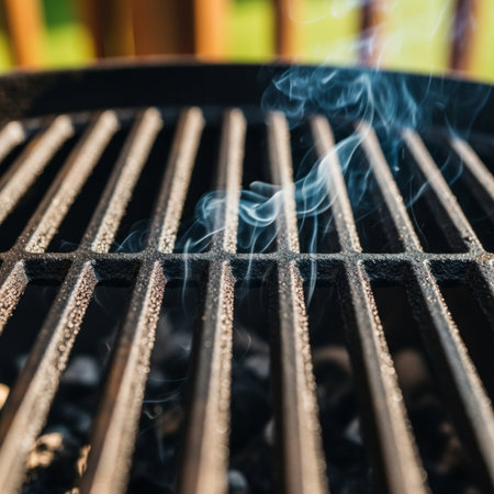 Embrace the warmth and ambiance of glowing charcoal embers surrounded by wisps of smoke in an outdoor setting, perfect for camping and cooking experiences.
