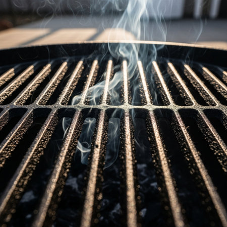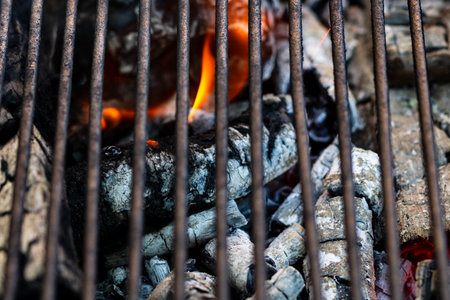Red hot embers glowing beneath a metal grill grate on a dirty charcoal barbecue, creating an inviting atmosphere for outdoor cooking and summer gatherings with friends and family