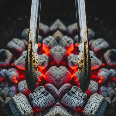 Hero detail shot of stainless steel grilling tongs resting directly on intensely hot, glowing lump c