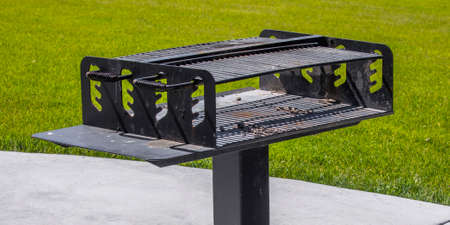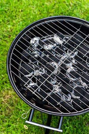 Barbecue with burning coals for cooking meat outdoors. Summer atmosphere and hiking with friends. High quality photo