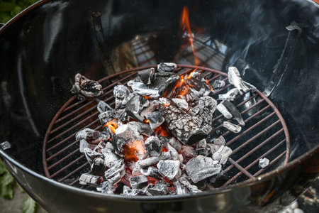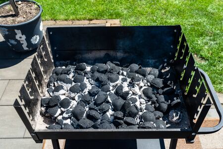 Glowing wood charcoal with small flames and smoke in a black grill, preparation for a barbecue, copy space, selected focus, narrow depth of field