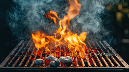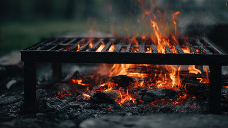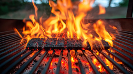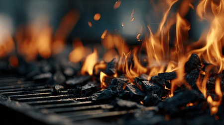 Glowing charcoal sits on a grill, surrounded by lively flames during a warm summer evening. The fire flickers and crackles, promising delicious food awaits as friends gather around.