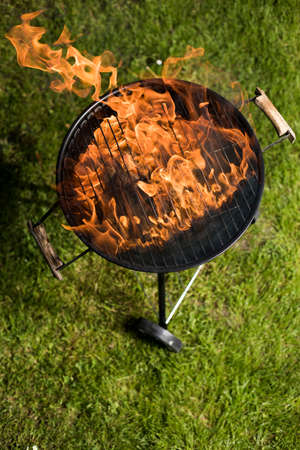 Flaming charcoal in BBQ appliance. Lawn in the background.