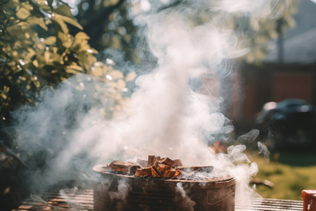 A backyard BBQ grill filled with various meats and vegetables, engulfed in smoke, creating a delicious and inviting scene for outdoor cooking.