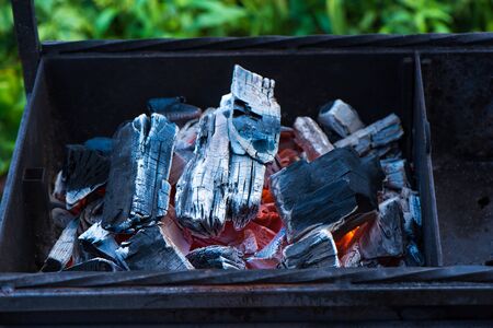 Burning coal. Hot burning and glowing coal. Kindle coal for barbecue in the garden.