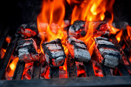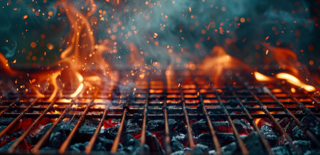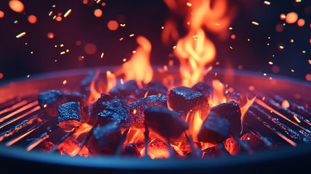 A close-up view of glowing charcoal in a grill, showcasing vibrant flames and ember. Ideal for themes related to cooking, summer gatherings, and outdoor dining.