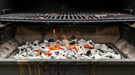 Burning charcoal with glowing embers and sparks on metal grill, creating warm and fiery atmosphere for outdoor cooking or barbecue