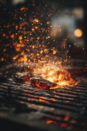 A dramatic close-up of a red-hot fire on a grill surface, with sparks flying upward. The warm, moody lighting creates a sense of energy and passion, captured in cinematic realism.