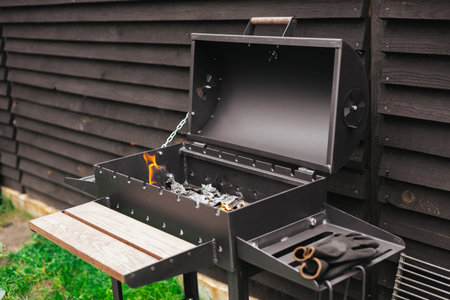 A black barbecue grill with a fire burning, ready for a cookout on a summer day. An outdoor barbecue grill is open, with a fire burning inside, set against a dark wooden wall.