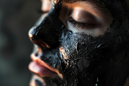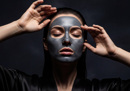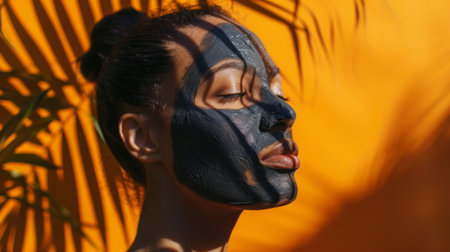 A serene woman with a detoxifying charcoal facial mask, eyes closed in relaxation, conveying a sense of luxury skincare and purification