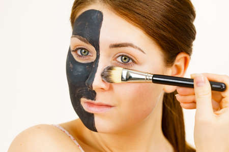 Skin care. Female applying black purifying mud mask, cosmetic healing clay to half face, using brush. Beauty and wellness. Spa and acne treatment.