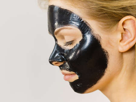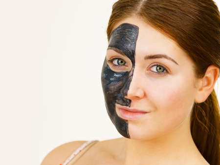 Skin care. Woman with charcoal facial mask, deep cleanser on half face. Beauty, spa and acne treatment.