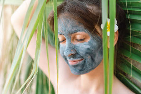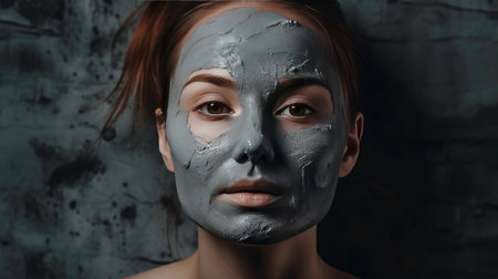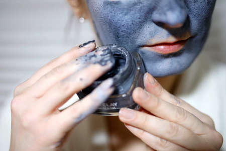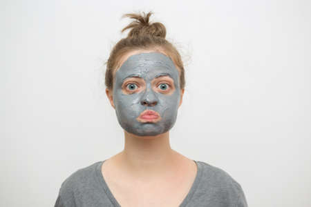 Young caucasian woman with black or grey facial clay mask on her funny face