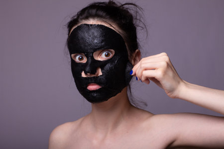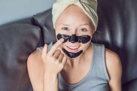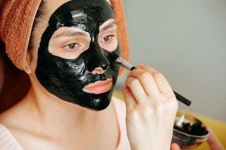 Girl applying charcoal peel off mask on face, skin care products, mask application, beauty products.