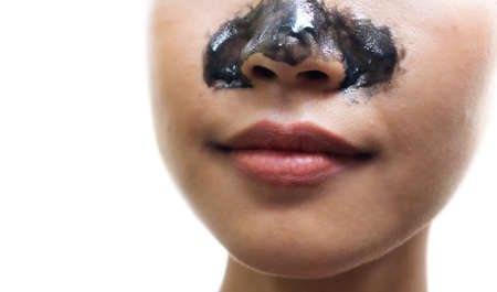 Young woman with carbo detox black peel-off mask on her face, on white. Teen girl taking care of oily skin, cleaning the pores. Beauty treatment. Skincare.